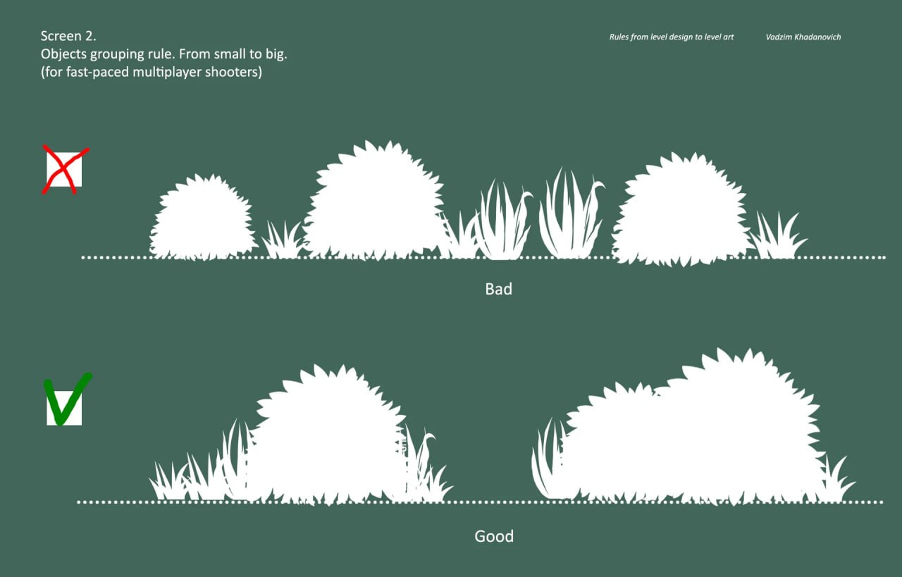 Мелкие объекты следует группировать с более крупными, чтобы создавать чёткие, крупные формы. Нежелательно высаживать много кустов и травы отдельно, так как это создаёт визуальный шум в кадре.